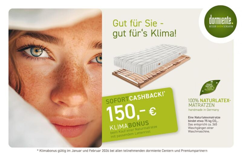 Sichert euch im Januar und Februar 150,-€ Sofort-Cashback* als KLIMABONUS beim Kauf einer dormiente Naturmatratze mit passendem Lattenrost.